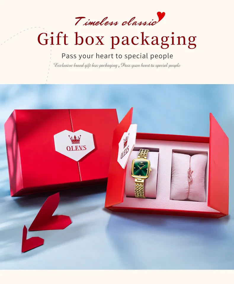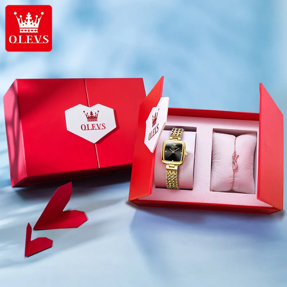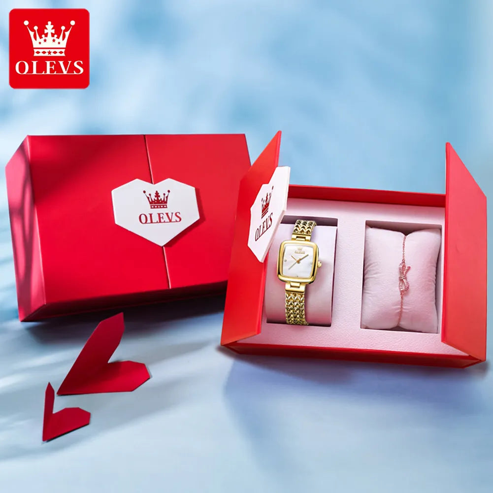 OLEVS Women Watches Elegant Quartz Wristwatch Stainless Steel Mesh Belt Gold Watch Square Dial Original Watch Bracelet Set Gift